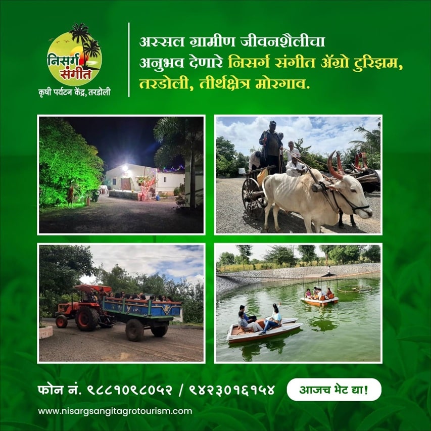 Welcome to Nisarg Sangit Agro Tourism – where nature meets tradition and every visitor becomes part of the village story. Located amidst serene countryside, our agro-tourism center offers a unique blend of organic farming, rural lifestyle, and cultural festivities. From farm-fresh produce to vibrant local celebrations, we invite you to experience the true spirit of Maharashtra's heartland.